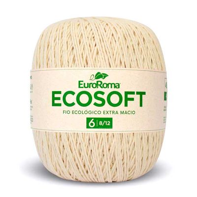 O Barbante Ecosoft da EuroRoma, possui uma textura e maciez sem igual no mercado, ainda com a pegada ecológica pois possui um processo de produção sustentável por que não utiliza água em sua produção. A espessura 8/12 cabos resulta em um fio similar ao nº 6, mas que através de um processo de fabricação moderno e diferenciado resulta em uma textura muito suave, leve e gostosa de trabalhar.