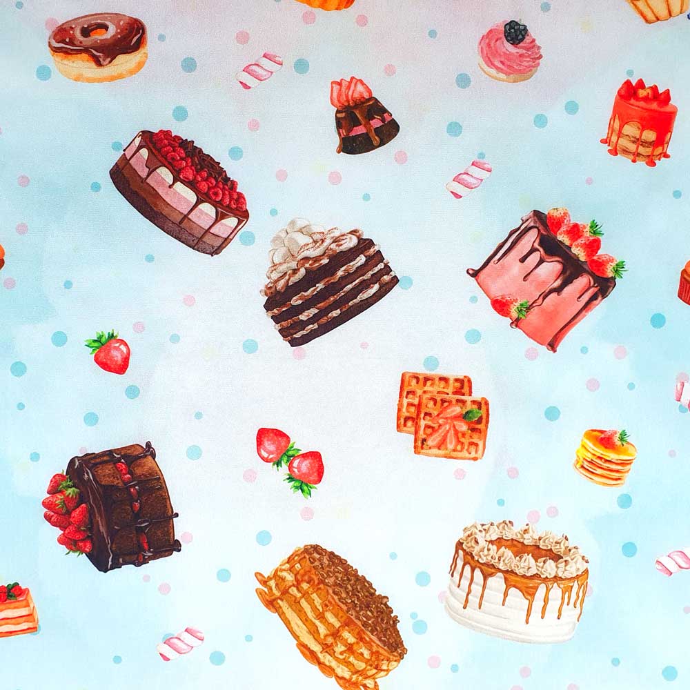 Tecido Tricoline Digital Confeitaria Fundo Azul é 100% algodão, ideal para trabalhos em vestuário, como camisete, saias, camisa, também indicado para decoração de ambiente, tais quais almofadas, puff, revestimentos de parede, sousplat, lençol de solteiro, muito utilizado no patchwork como jogo de tapete, jogo americano, quilting, colchas, bolsas, estojos e artesanato como lenço e tiaras para cabelo, kit infantil, protetor de berço, almofada de amamentação, babador, nécessaire, revestimento em artesanato de MDF e muito mais. Com largura de 1,50 m você pode trabalhar com estilos de estampas variadas combinando como poá, floral, infantil, arabesco, texturas, coleções de personagens exclusivos e muito mais.