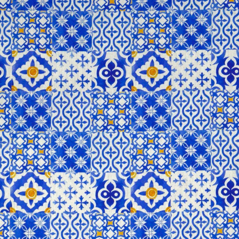 O Tricoline Azulejos Portugueses é uma estampa com personalidade arquitetônica: padrões geométricos e arabescos em azul royal, azul-cobalto e branco, com detalhes em amarelo-ouro, reproduzem o visual dos azulejos de fachada tão característicos da cultura portuguesa. Cada bloco traz um padrão diferente — cruzes, estrelas, arabescos e flores estilizadas — criando aquela composição de patchwork de azulejos que prende o olhar.