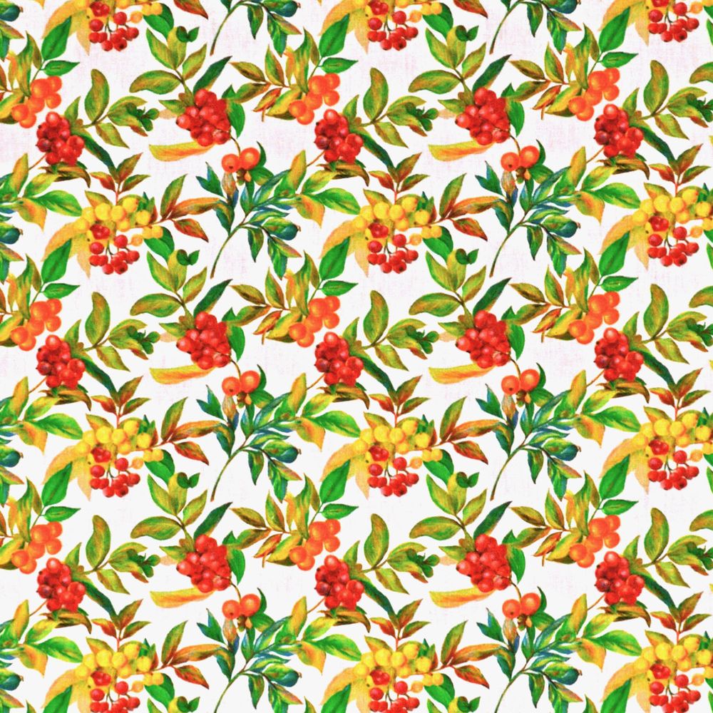 O Tricoline Bagas e Folhas tem o frescor de uma ilustração botânica: galhos com folhas em diferentes tons de verde, do esmeralda ao amarelo-outonal, carregam cachos de bagas vermelhas e laranjas sobre fundo branco. A composição é densa e bem distribuída, com aquela vitalidade de jardim em plena frutificação que anima qualquer projeto sem precisar de muito mais.
