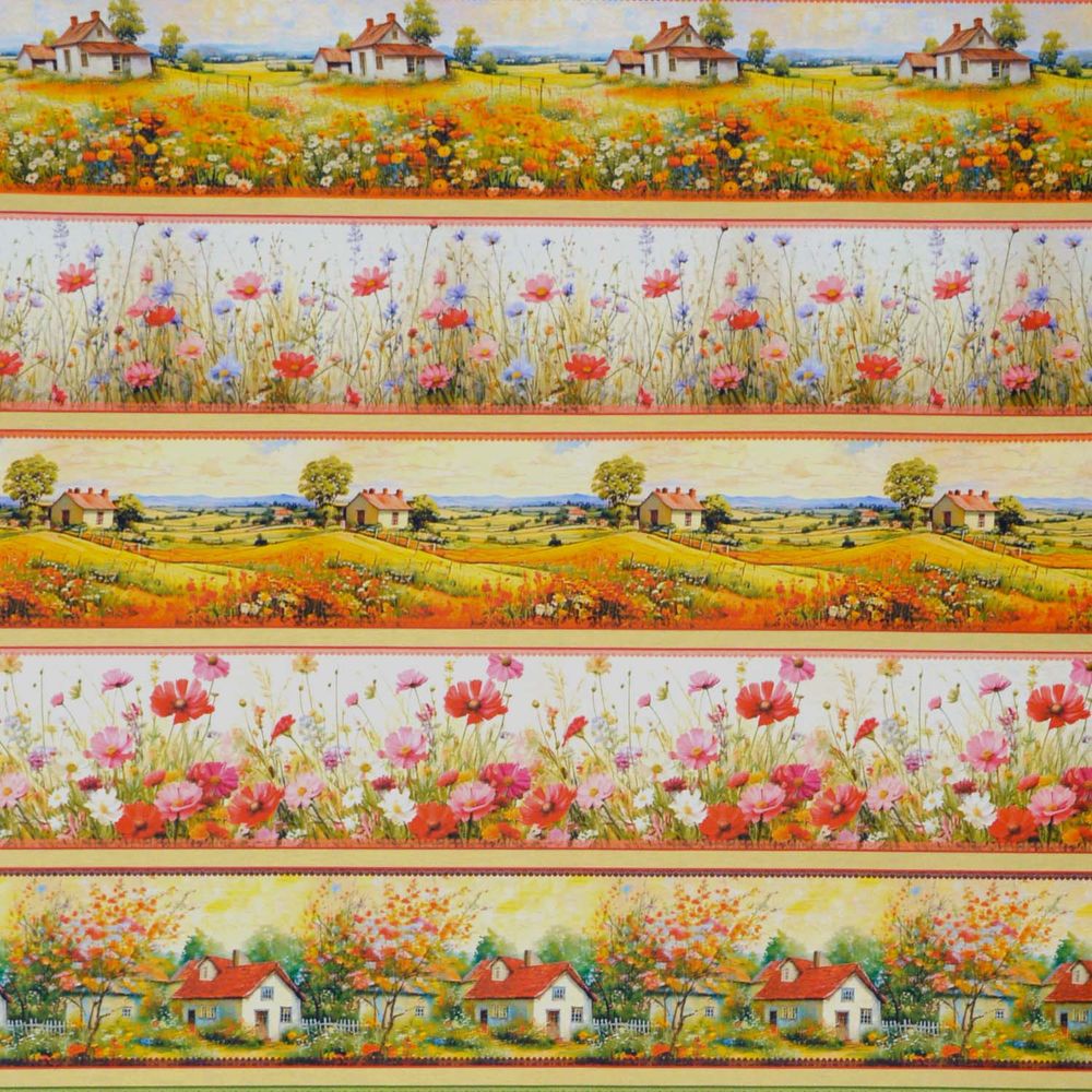 Tricoline Barrado Digital Chácara leva para o tecido a beleza das paisagens rurais: campos floridos com papoulas, cosmos e flores silvestres alternam com cenas de chácaras e casas de telhado vermelho em tons quentes de laranja, amarelo e verde. São dez barras com alta definição digital, cada uma com uma cena diferente que transmite tranquilidade e charme do interior.