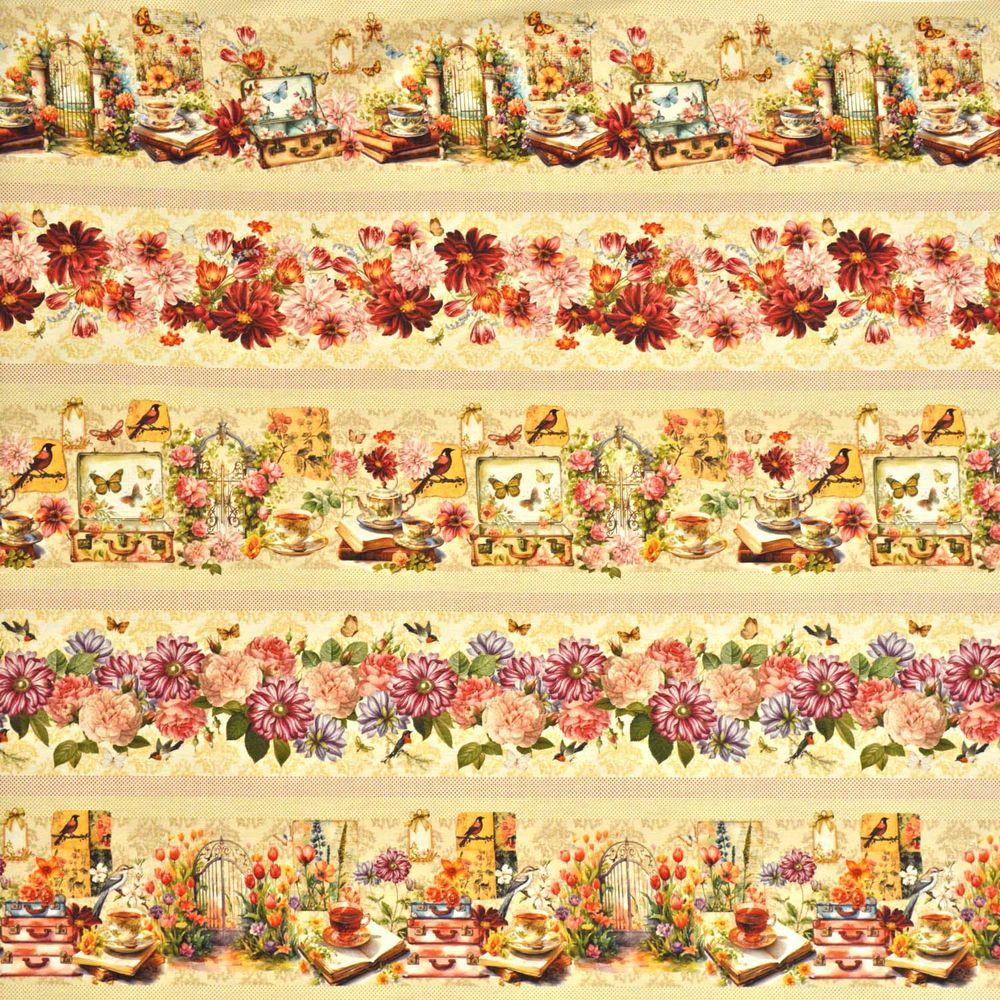 O Tricoline Barrado Digital Jardim das Dálias é uma das estampas mais exuberantes que um barrado pode oferecer. As 10 faixas apresentam cenas alternadas: ora arranjos densos de dálias em vinho, coral e lilás, ora composições encantadas com pássaros, borboletas, malas de viagem antigas, xícaras de chá, livros e portões ornamentados — tudo em tons quentes de dourado, terracota e rosa sobre fundo bege amanteigado. Cada faixa conta um pedaço de uma história diferente, criando aquele visual rico e narrativo que só a impressão digital consegue entregar com essa nitidez e profundidade de cor.