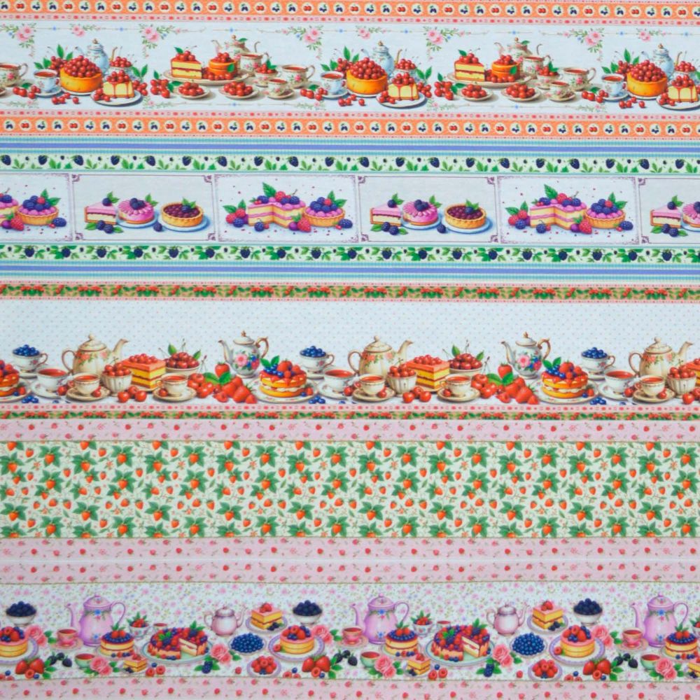É o tipo de barrado que vende sozinho em kits de presente: panos de prato para presentear no Dia das Mães, toalhas de chá para cozinhas românticas, aventais para confeiteiras e necessaires temáticas para quem ama doces. Cada barra tem uma composição própria entre cenas de mesa posta e close de sobremesas, facilitando o aproveitamento criativo do tecido.