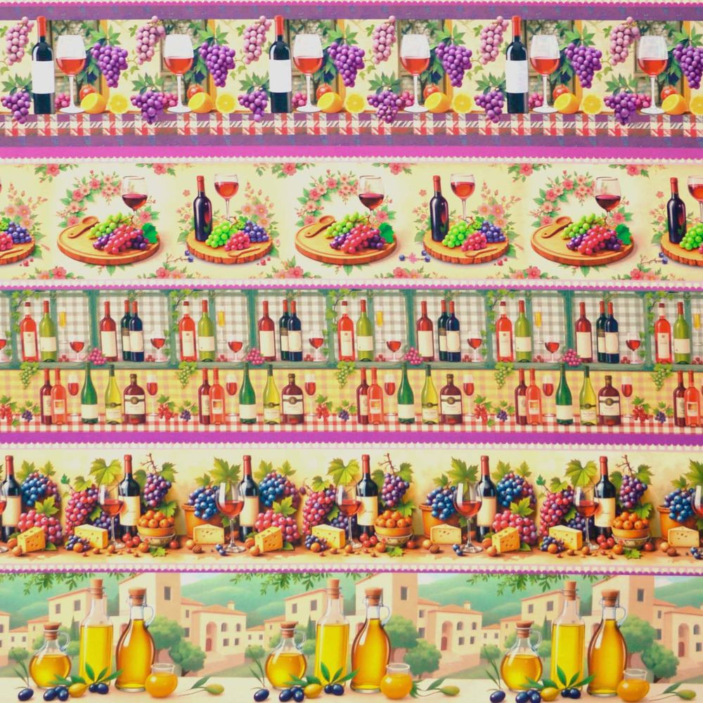 Uma tarde na Toscana em forma de tecido — é assim que o Tricoline Barrado Digital Vinhos e Uvas se apresenta. As dez barras percorrem vinhedos com cachos coloridos, tábuas de frios com vinho e uvas, fileiras de garrafas, taças elegantes e até uma vila italiana ao fundo, com azeites dourados abrindo e fechando a composição. A paleta em roxo, verde e dourado tem aquela sofisticação que poucos barrados conseguem.