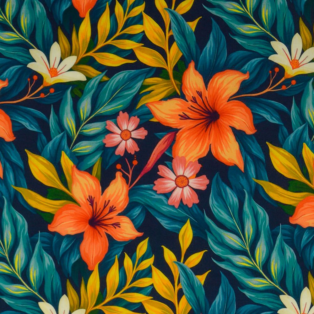 O Tricoline Digital Floral Hibiscos Tropicais Fundo Azul Marinho combina um fundo azul marinho intenso com hibiscos em laranja vibrante, folhagens verde-teal e amarelo, flores brancas e pequenas flores rosas — uma composição tropical exuberante com cores que se destacam com força sobre o fundo escuro.