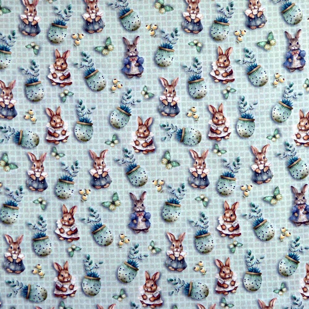 Tricoline Digital Páscoa Coelhas é 100% algodão, ideal para trabalhos em vestuário, como camisete, saias, camisa, pijama infaltil e adulto, também indicado para decoração de ambiente, tais quais almofadas, puff, revestimentos de parede, sousplat, lençol de solteiro, muito utilizado no patchwork como jogo de tapete, jogo americano, quilting, colchas, bolsas, estojos e artesanato como lenço e tiaras para cabelo, kit infantil, protetor de berço, almofada de amamentação, babador, nécessaire, revestimento em artesanato de MDF e muito mais. Com largura de 1,50 m você pode trabalhar com estilos de estampas variadas combinando como poás, florais, infantis, arabesco, texturas, coleções de personagens exclusivos e muito mais
