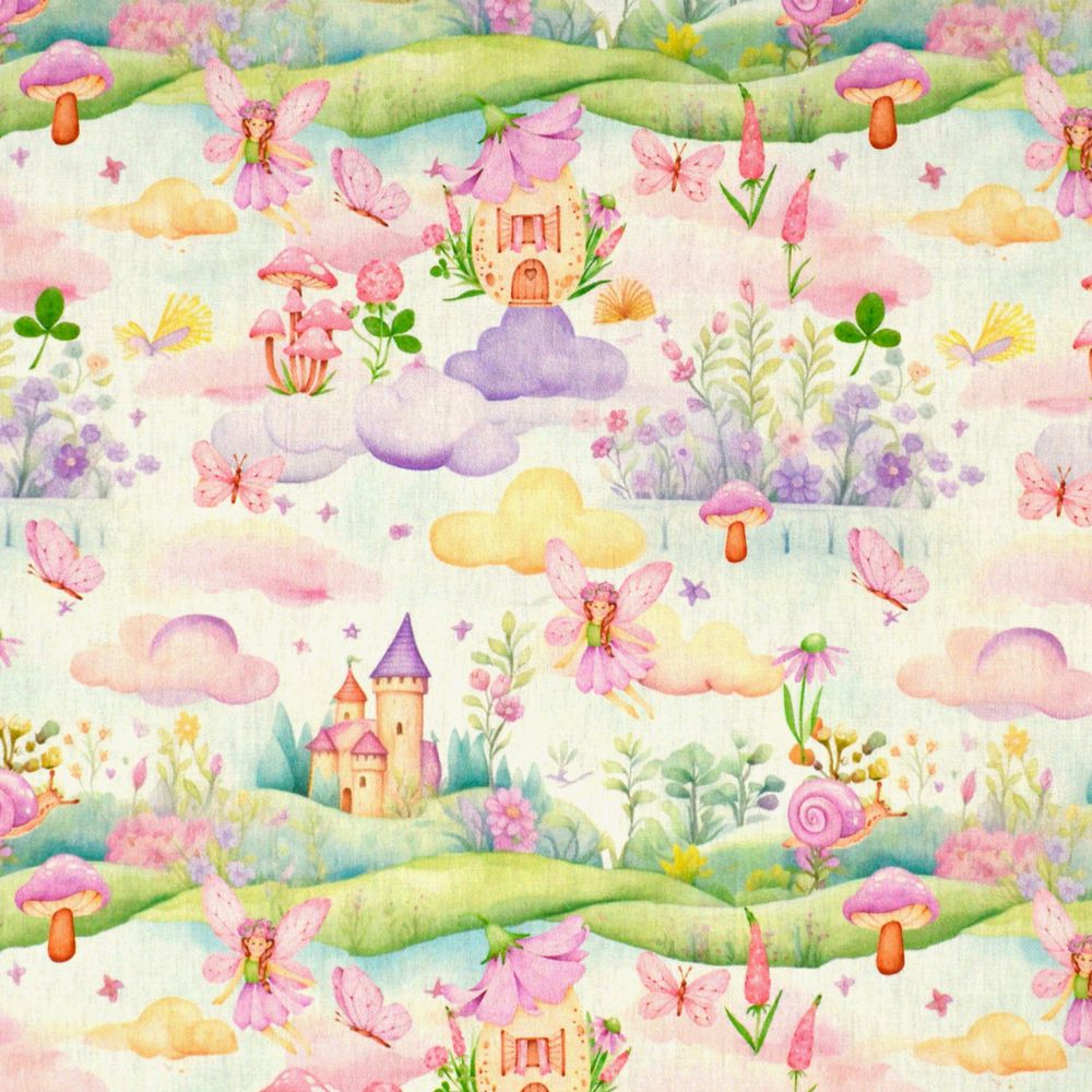 O Tricoline Fadas e Castelos é uma estampa cênica e detalhada que constrói um reino encantado completo: fadas de asas rosadas voando entre nuvens coloridas, castelos medievais, cogumelos mágicos, borboletas, flores silvestres e uma casinha suspensa numa nuvem lilás. A paleta em rosa, lilás, verde e amarelo pastel cria uma atmosfera de conto de fadas sem pesar na composição.