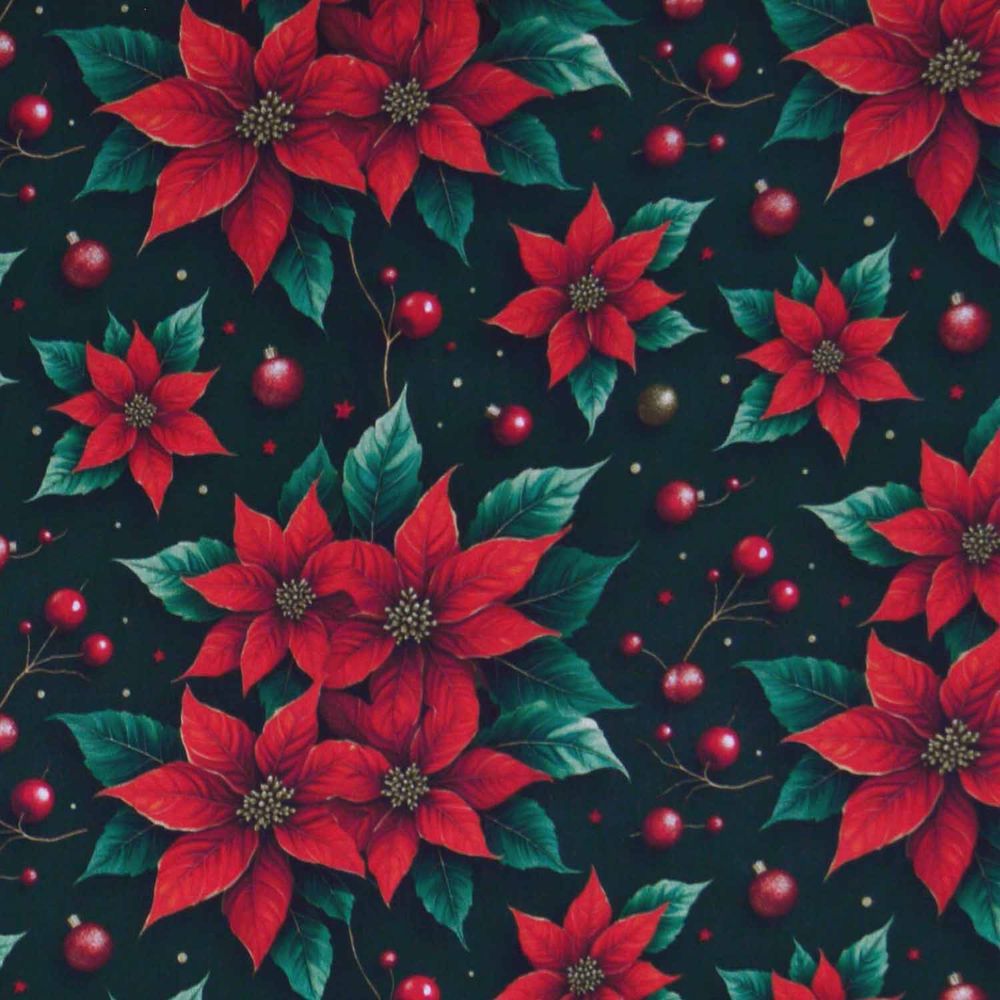 Tricoline Digital Flor Poinséttia Fundo Verde Escuro é 100% algodão, ideal para trabalhos em vestuário, como camisete, saias, camisa, pijama infaltil e adulto, também indicado para decoração de ambiente, tais quais almofadas, puff, revestimentos de parede, sousplat, lençol de solteiro, muito utilizado no patchwork como jogo de tapete, jogo americano, quilting, colchas, bolsas, estojos e artesanato como lenço e tiaras para cabelo, kit infantil, protetor de berço, almofada de amamentação, babador, nécessaire, revestimento em artesanato de MDF e muito mais. Com largura de 1,50 m você pode trabalhar com estilos de estampas variadas combinando como poás, florais, infantis, arabesco, texturas, coleções de personagens exclusivos e muito mais