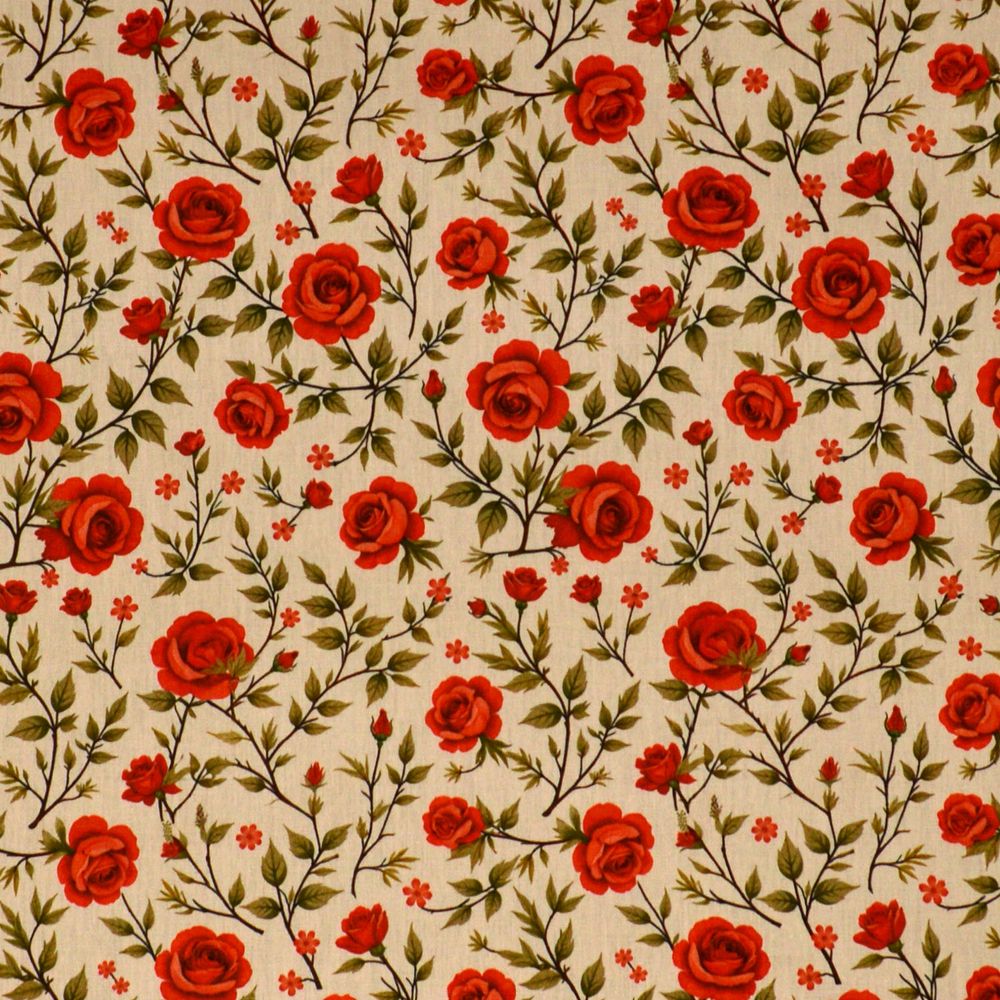 O Tricoline Florais Rosas Vermelhas apresenta rosas vermelhas clássicas sobre fundo creme, distribuídas em hastes finas com folhagens verde-oliva e pequenas flores miúdas espalhadas pela composição. O vermelho das rosas é sólido e bem saturado, criando um contraste elegante com o fundo neutro sem perder o charme do floral tradicional.