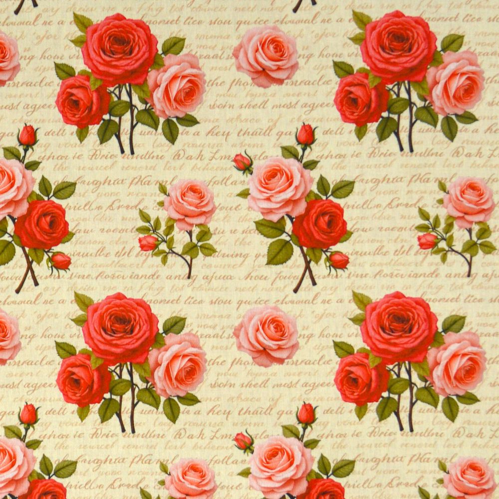 O Tricoline Rosas Vermelhas Coral é uma estampa clássica com presença: rosas grandes em vermelho intenso e rosa coral, com botões e folhas verdes, distribuídas sobre fundo creme com texto cursivo decorativo em dourado-sépia ao fundo. A sobreposição da escrita cria uma textura visual sofisticada que eleva o estampado além do floral comum.