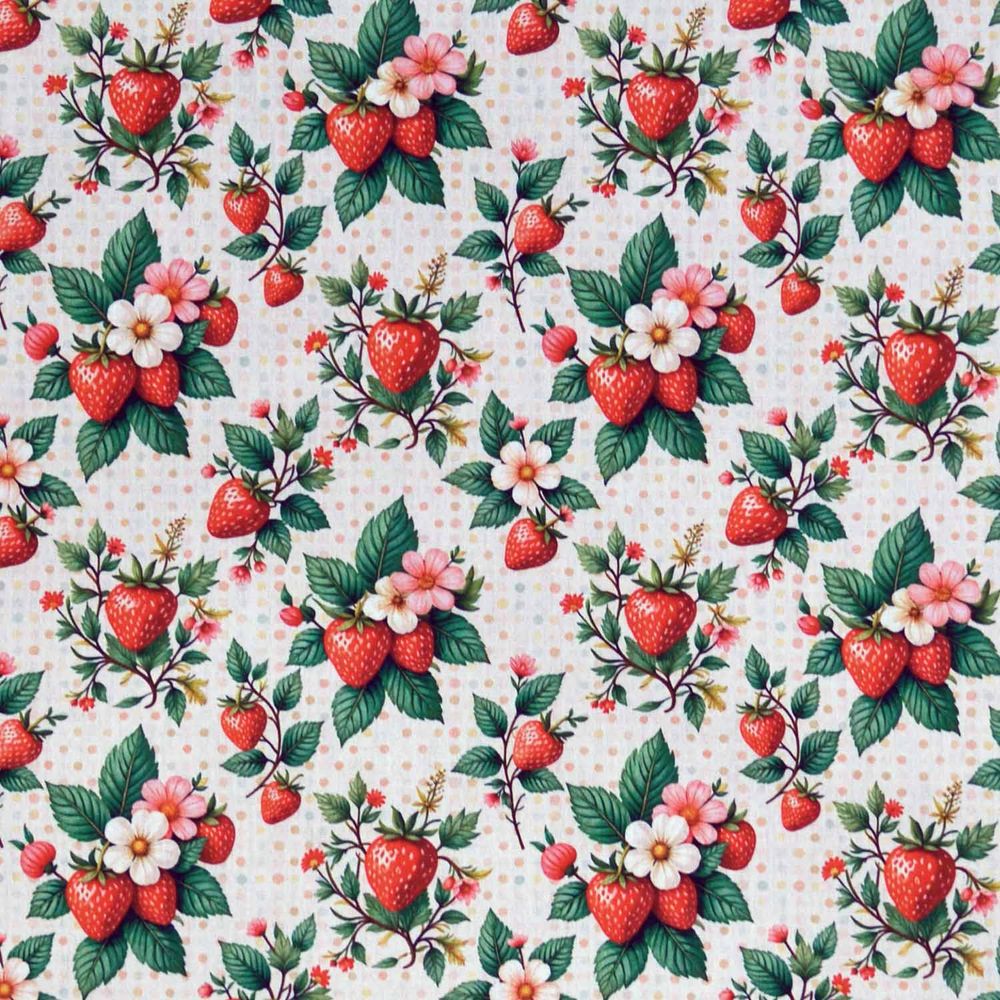 Tricoline Flores e Morangos é 100% algodão, ideal para trabalhos em vestuário, como camisete, saias, camisa, pijama infaltil e adulto, também indicado para decoração de ambiente, tais quais almofadas, puff, revestimentos de parede, sousplat, lençol de solteiro, muito utilizado no patchwork como jogo de tapete, jogo americano, quilting, colchas, bolsas, estojos e artesanato como lenço e tiaras para cabelo, kit infantil, protetor de berço, almofada de amamentação, babador, nécessaire, revestimento em artesanato de MDF e muito mais. Com largura de 1,50 m você pode trabalhar com estilos de estampas variadas combinando como poás, florais, infantis, arabesco, texturas, coleções de personagens exclusivos e muito mais