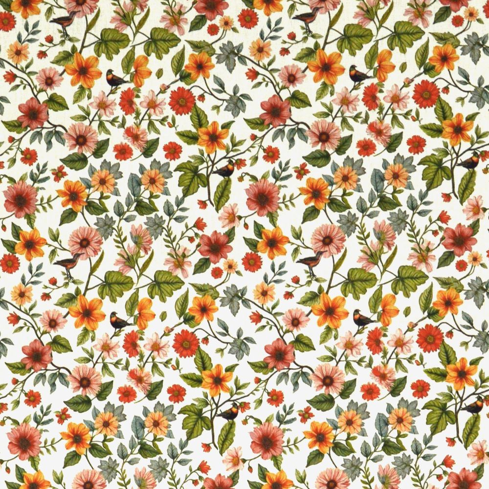 O Tricoline Flores Silvestre tem a abundância de um jardim em plena floração: flores em laranja, coral, rosa e amarelo em diferentes tamanhos se abrem entre galhos e folhas verdes sobre fundo branco-creme, com pequenos pássaros quase escondidos entre a vegetação. A composição é densa e movimentada, com aquela energia botânica vintage que parece saída de uma coleção de ilustrações de jardim do século XIX.