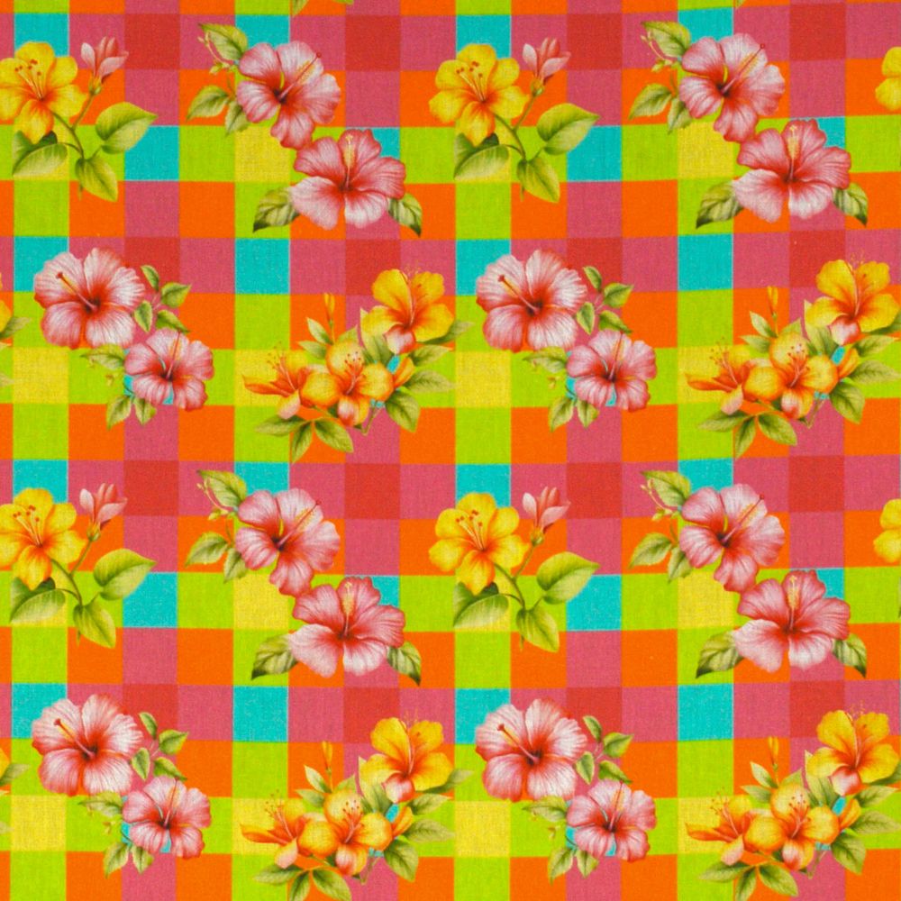 O Tricoline Hibiscos no Xadrez Neon é energia pura: hibiscos em rosa e amarelo com folhas verdes se distribuem sobre um xadrez de blocos grandes em verde-limão, laranja, pink e azul-turquesa — uma paleta neon que vibra e chama atenção mesmo de longe. É uma estampa que mistura o tropical com o festivo, resultando num tecido alegre que funciona tanto no São João quanto em projetos de verão.