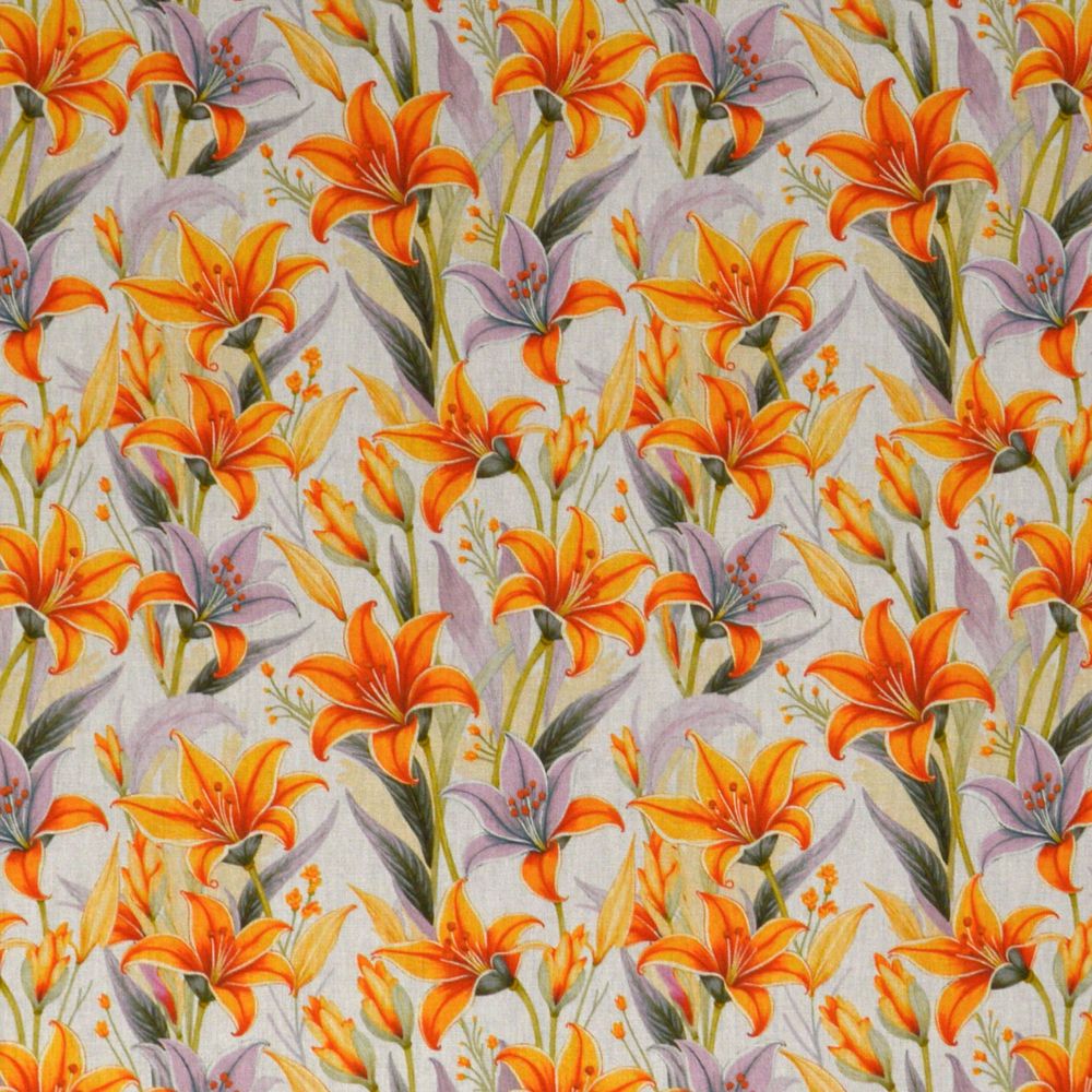 O Tricoline Lírios Alaranjados é uma estampa com presença imponente: lírios em laranja intenso, com pétalas abertas e botões em diferentes estágios de floração, se distribuem em profusão entre folhas longas em verde e cinza sobre fundo quase branco. Flores lilás em segundo plano equilibram o impacto do laranja, criando uma composição exuberante que ocupa o campo visual com muita elegância.