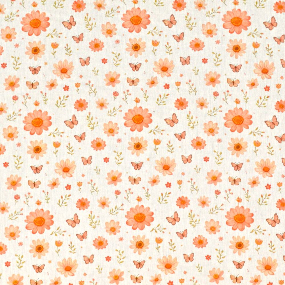 O Tricoline Margaridas e Borboletas tem a leveza de um dia de primavera: margaridas em salmão, pêssego e coral em tamanhos variados se distribuem de forma solta sobre fundo branco-linho texturizado, com borboletas em tons terrosos pousando aqui e ali entre os raminhos. A paleta toda em tons quentes de pêssego e terracota cria uma composição delicada e acolhedora, com aquele espírito aquarela que suaviza tudo ao redor.