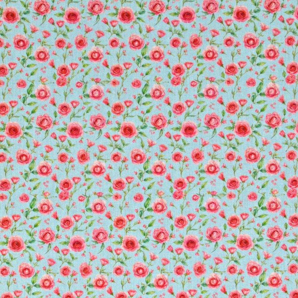 O Tricoline Rosas Rosa no Azul aposta num contraste que encanta: rosas e botões em rosa coral e vermelho com folhinhas verdes se distribuem de forma solta e bem espaçada sobre um fundo azul-turquesa suave. A composição tem aquele frescor de jardim de verão — as rosas em movimento, com hastes curtas e botões fechados alternando com flores abertas, criam ritmo visual sem sobrecarregar.